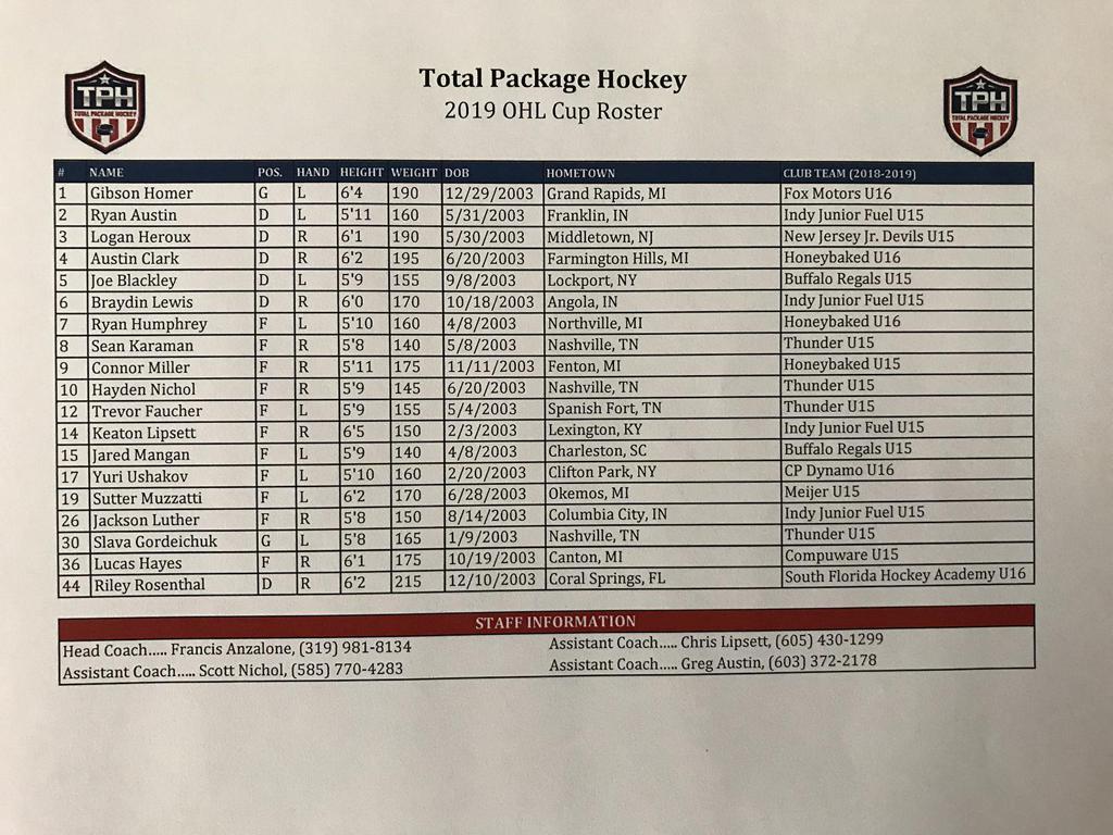 Total Package Hockey is proud to congratulate the players selected to represent TPH at the OHL Cup, and wish them luck as they begin competing in the prestigious annual tournament.